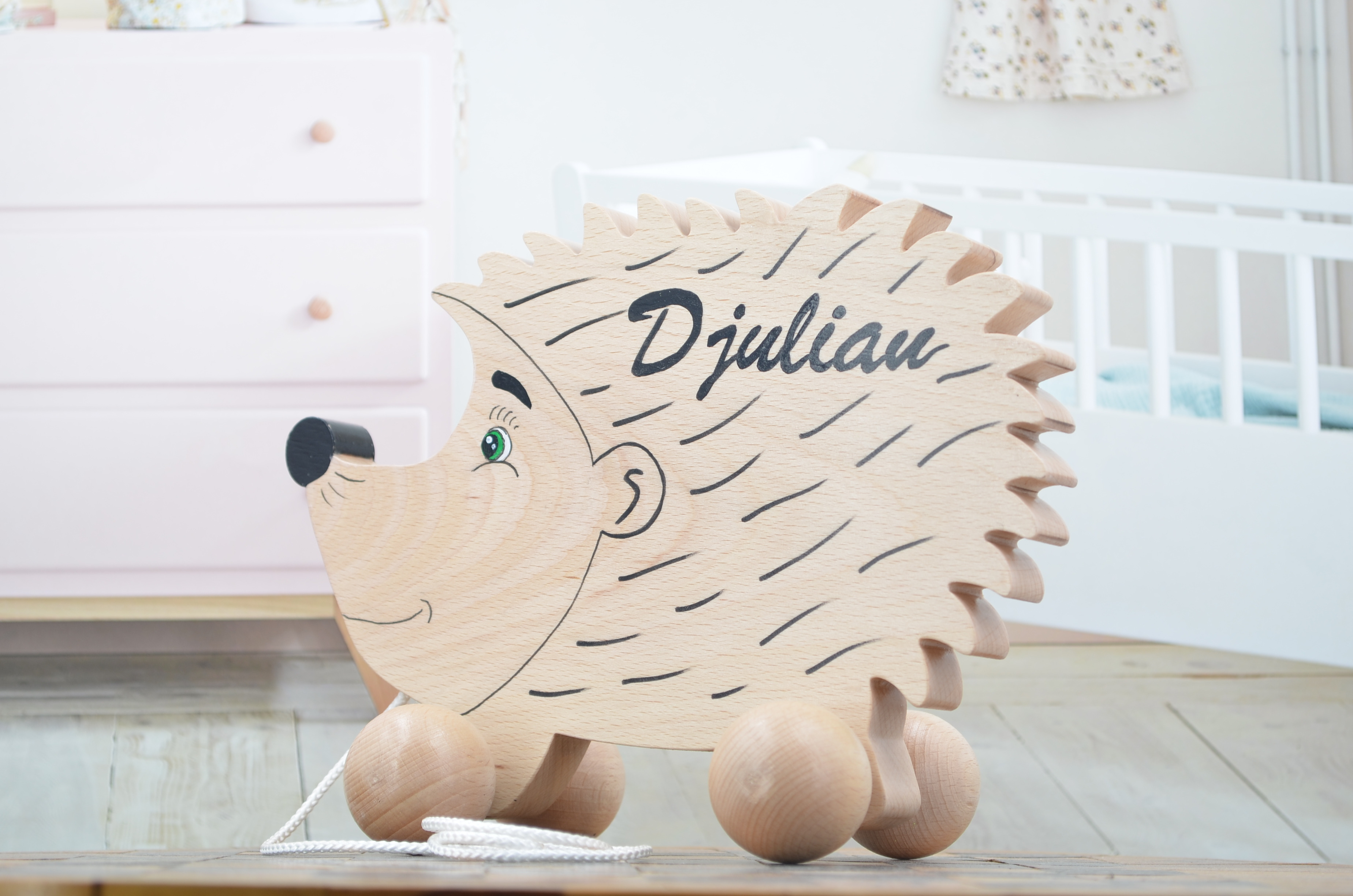 Voici la dernière création sur mesure : un joli hérisson à tirer. J'ai fabriqué ce petit mammifère quadrupède à partir du dessin fourni par ma cliente et voici le résultat !