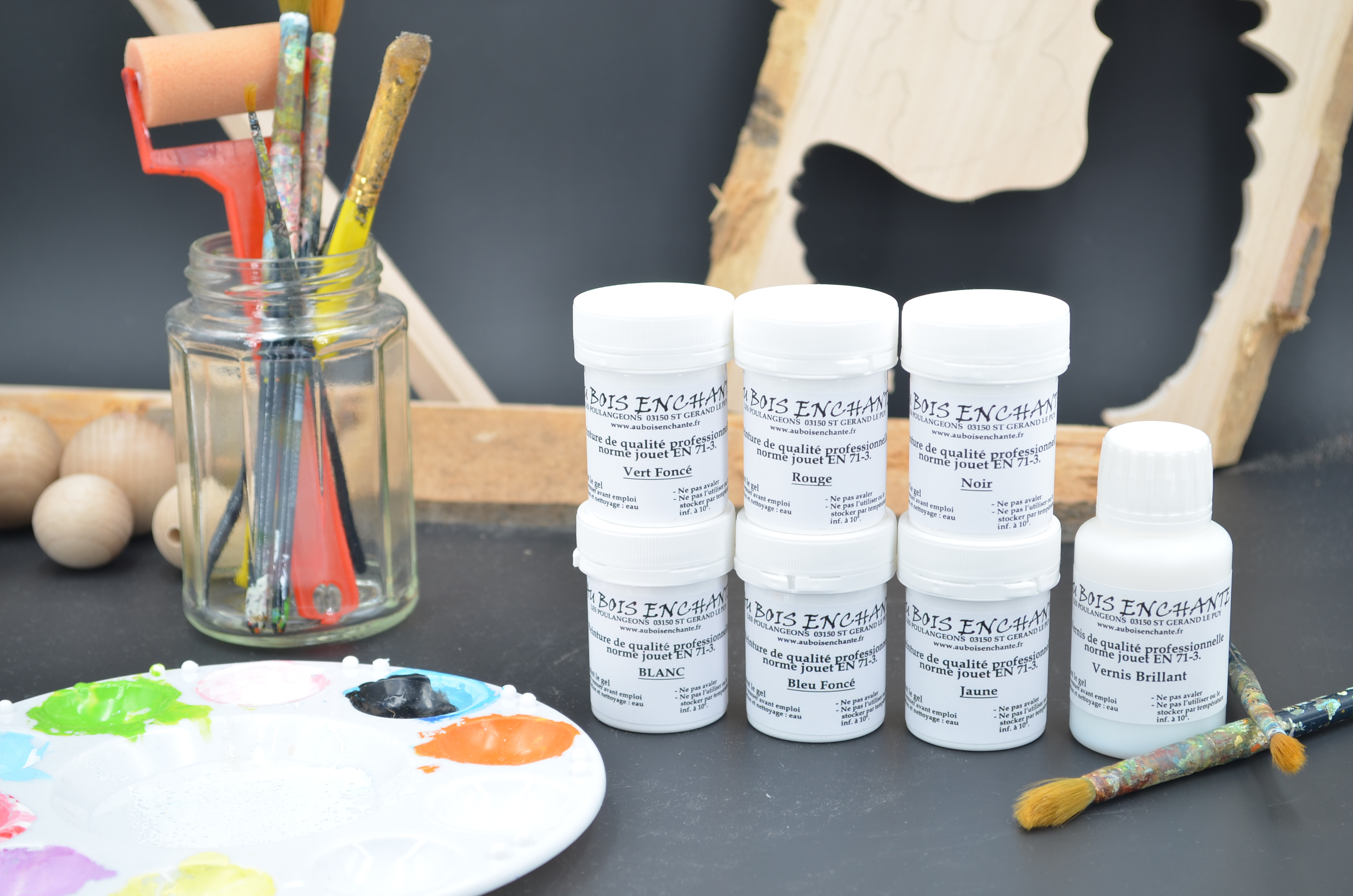Créatif dans l'âme ? Pas de souci, vous trouverez sur le site un kit peinture avec 6 pots de 60ml de peintures aux normes jouets : du blanc, du jaune, du rouge, du bleu, du vert et du noir ainsi qu'un vernis brillant aux normes jouets pour bien protéger vos créations en bois ! Alors à vos pinceaux et à très bientôt sur le site.